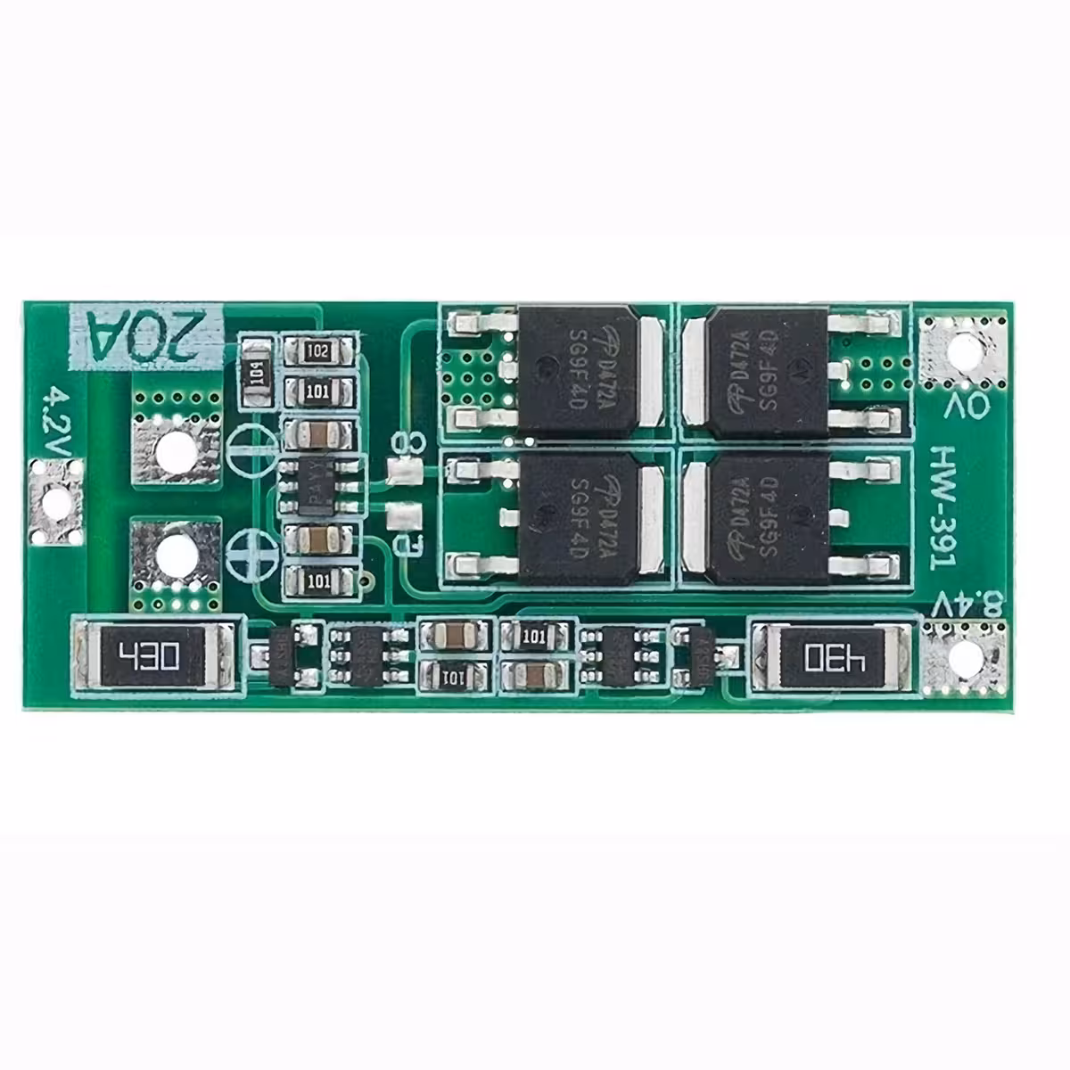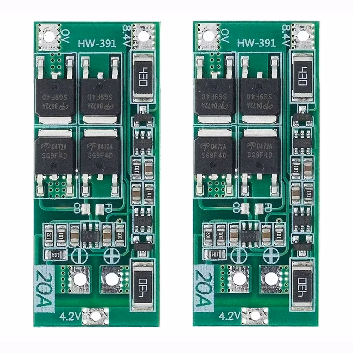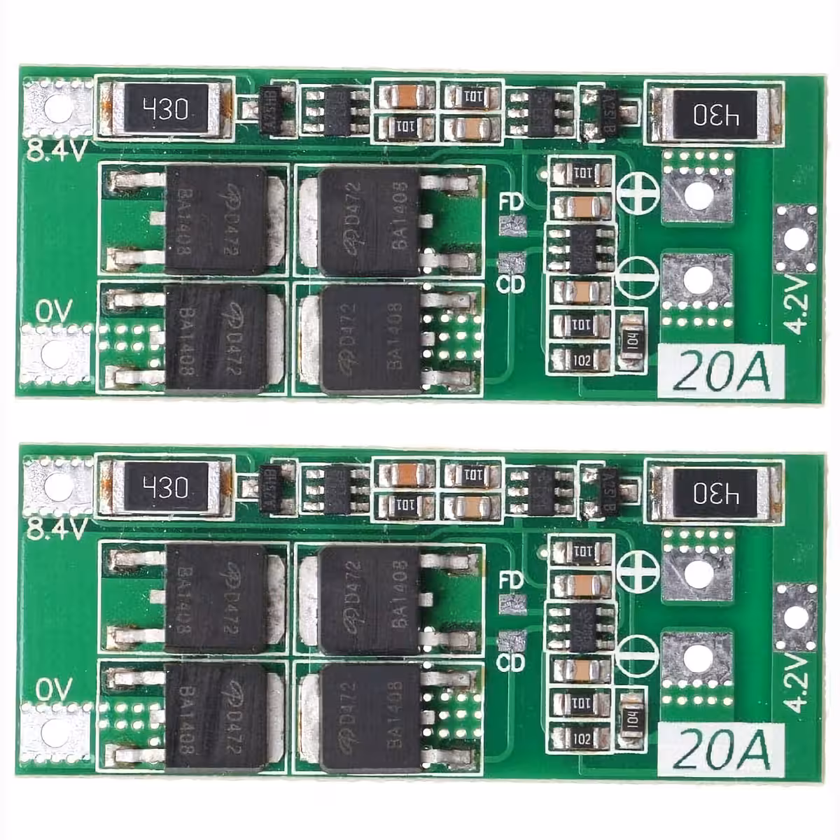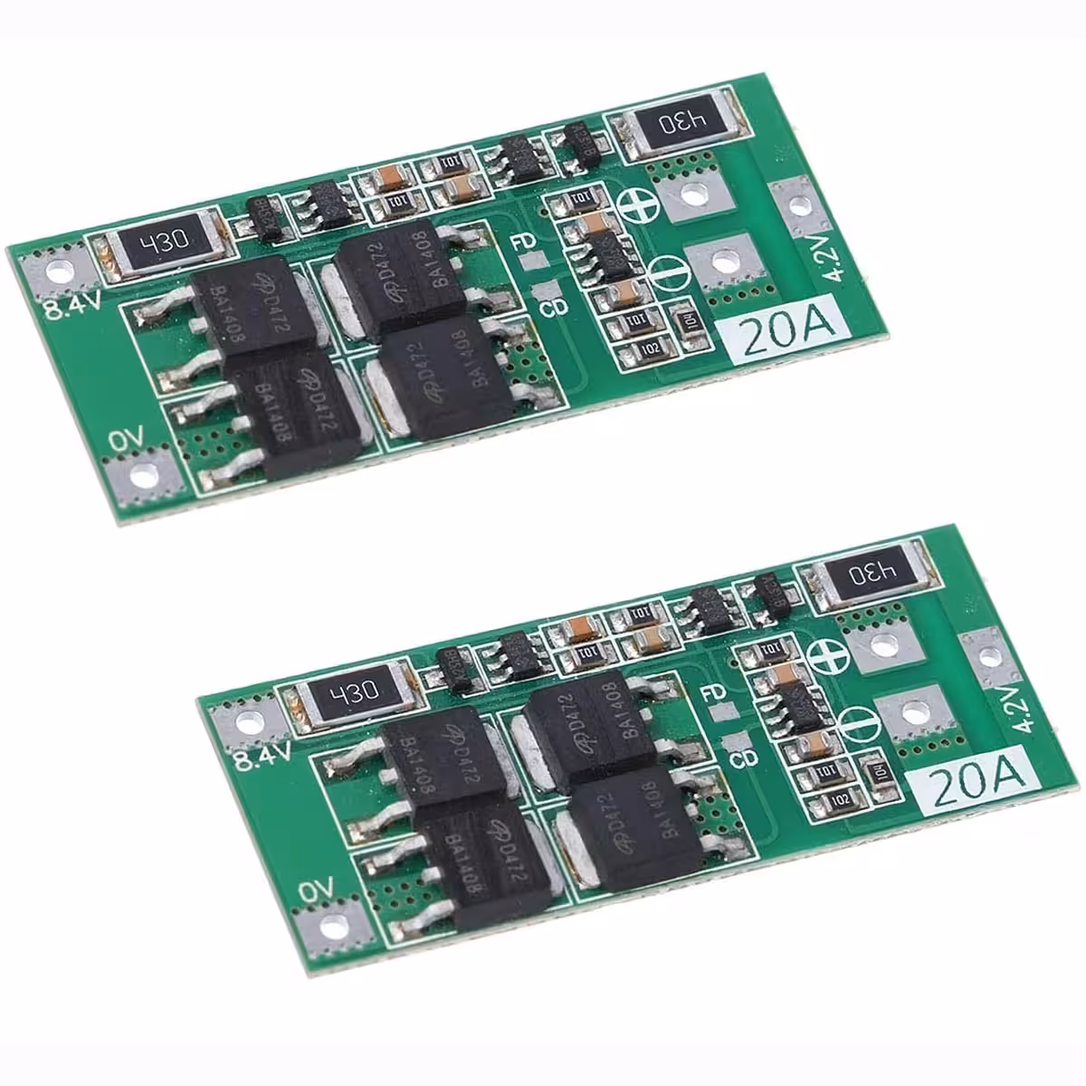 A készlet 2 db BMS 2S 20A (7.4V névleges / 8.4V teljes) modulból áll, balanszírozó funkcióval, amely Li-Ion akkumulátorok (beleértve 18650 és 26650 cellákat) védelmére és kezelésére készült. Teljes védelmet nyújt: túltöltés, túlmerítés, túláram, rövidzár és automatikus visszaállítás. Kompakt méretű, ideális DIY projektekhez és hordozható eszközökhöz.