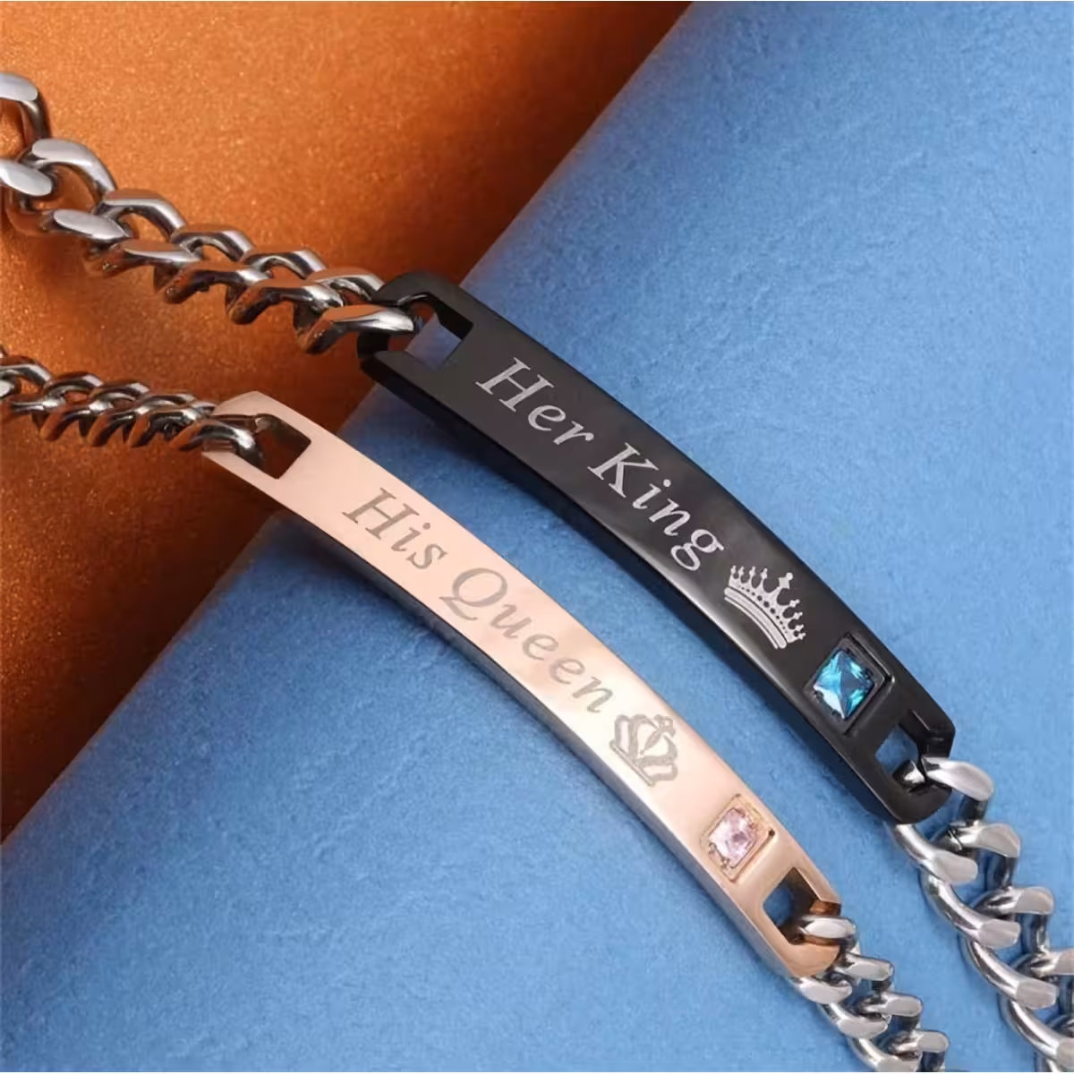 A szerelmes pároknak szánt karkötő készlet két ékszert tartalmaz, külön gravírozva a partnerek számára: Her King a férfinak és His Queen a nőnek.