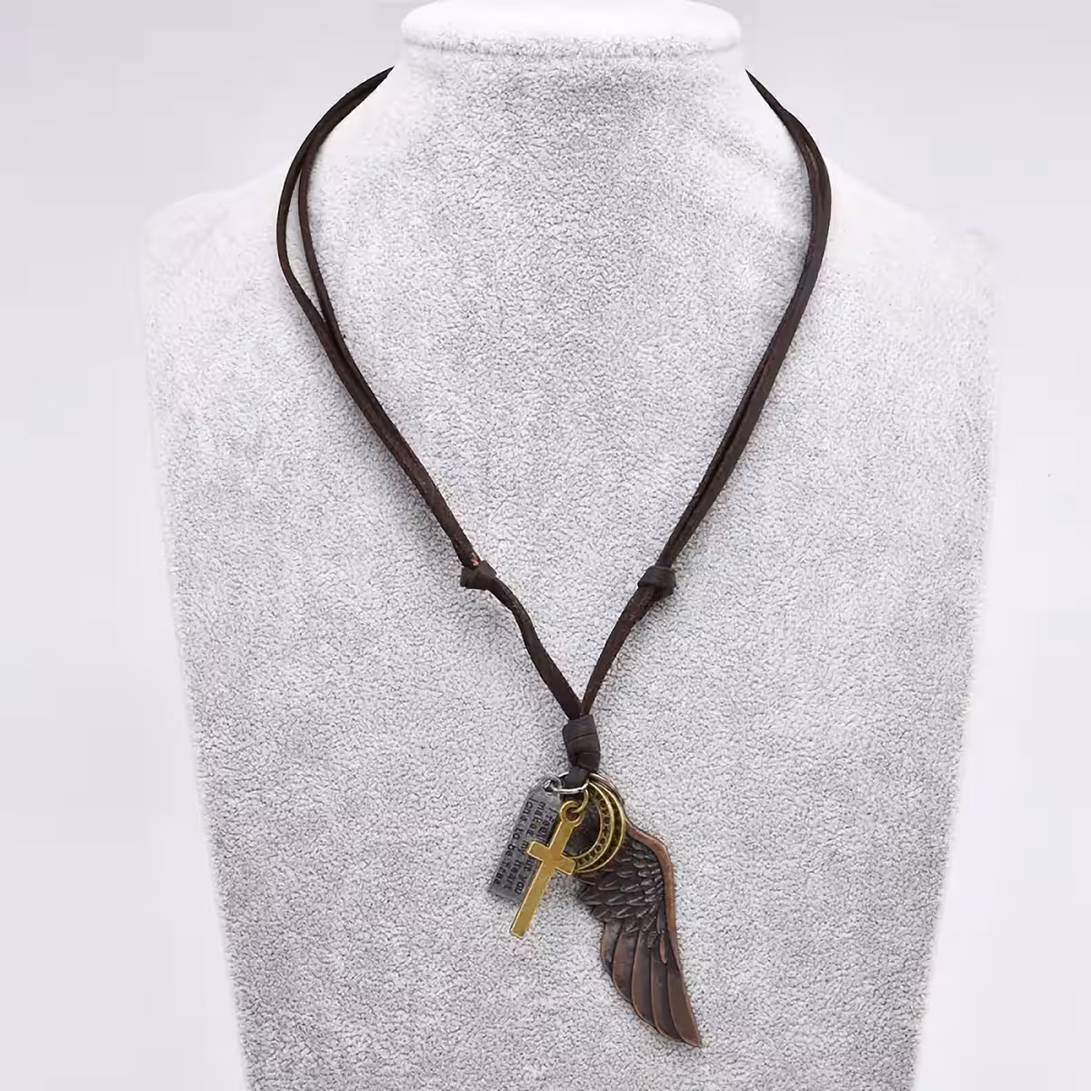 Ez a bőrlánc angyalszárny és kis kereszt medállal inspiráló választás azoknak a férfiaknak, akik értékes és stílusos kiegészítőt keresnek.