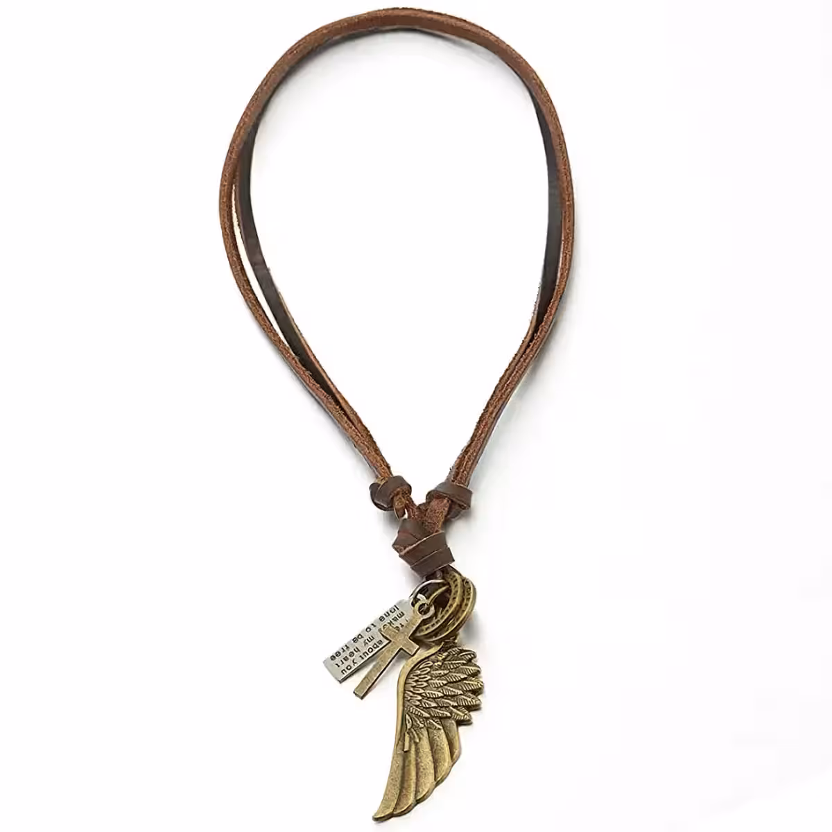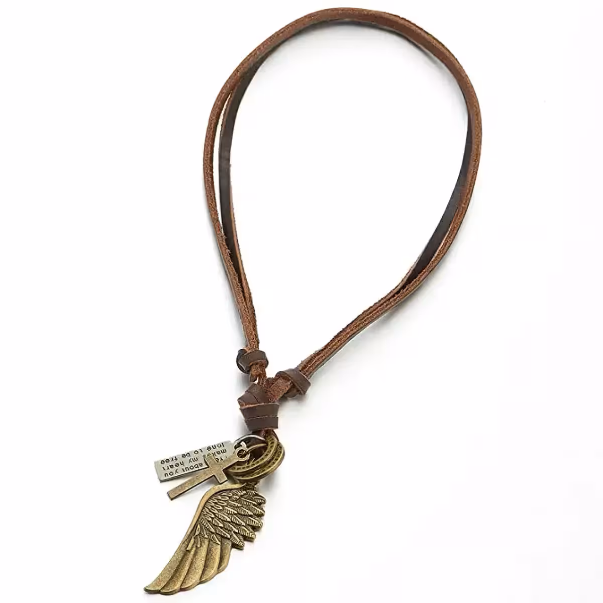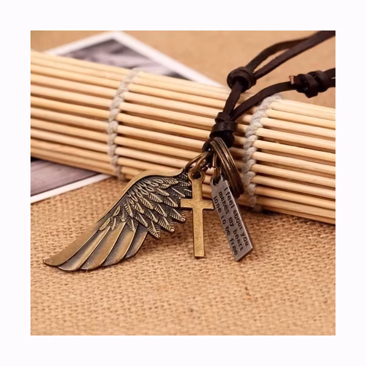 Ez a lánc a kiváló minőségű természetes bőrt ötvözi egy cinkötvözetből készült medállal, amely egy angyalszárnyat és egy finom kis keresztet ábrázol, egyedi és kifinomult megjelenést biztosítva.