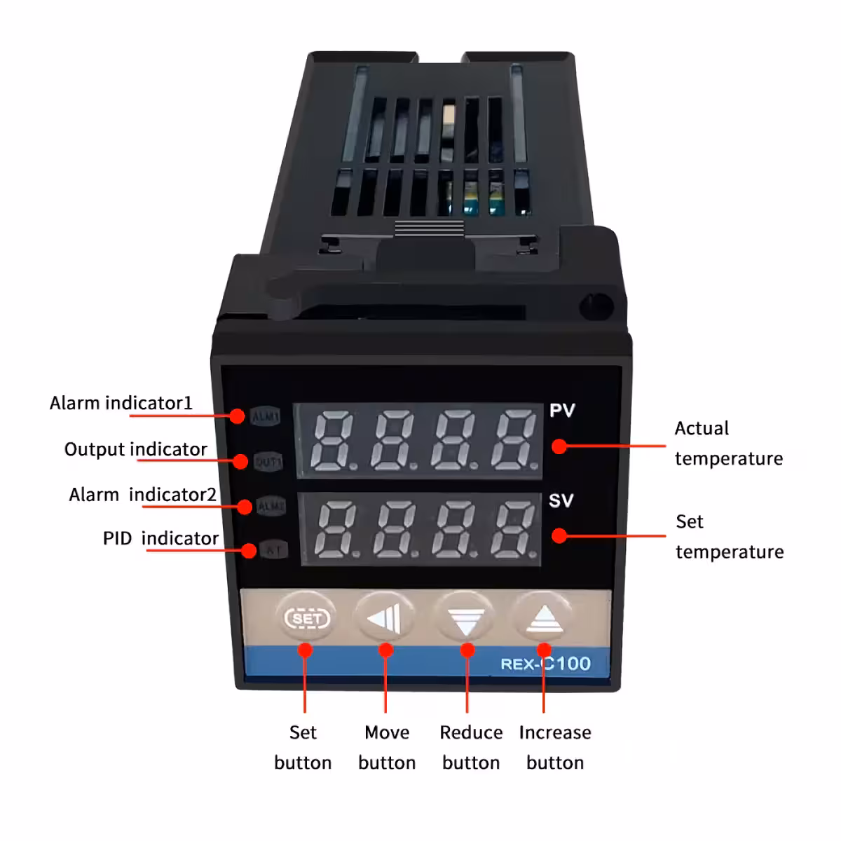 A digitális szabályozó folyamatosan figyeli a hőmérsékletet, és a beállító gombok segítségével könnyen állítható. A kijelzőn látható a jelenlegi hőmérséklet (PV) és a beállított hőmérséklet (SV).