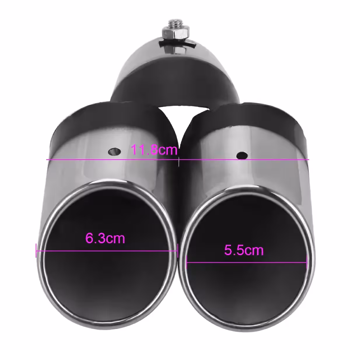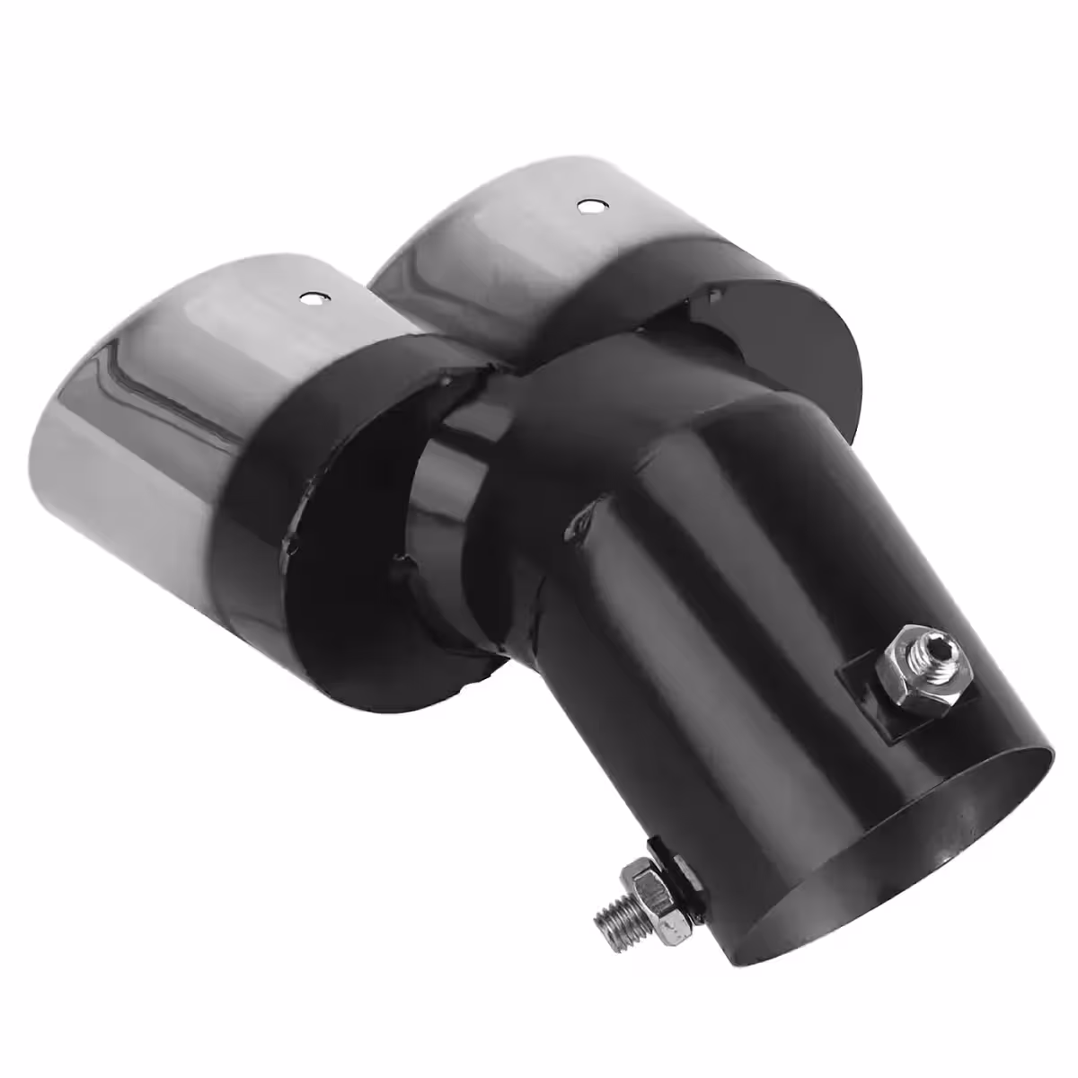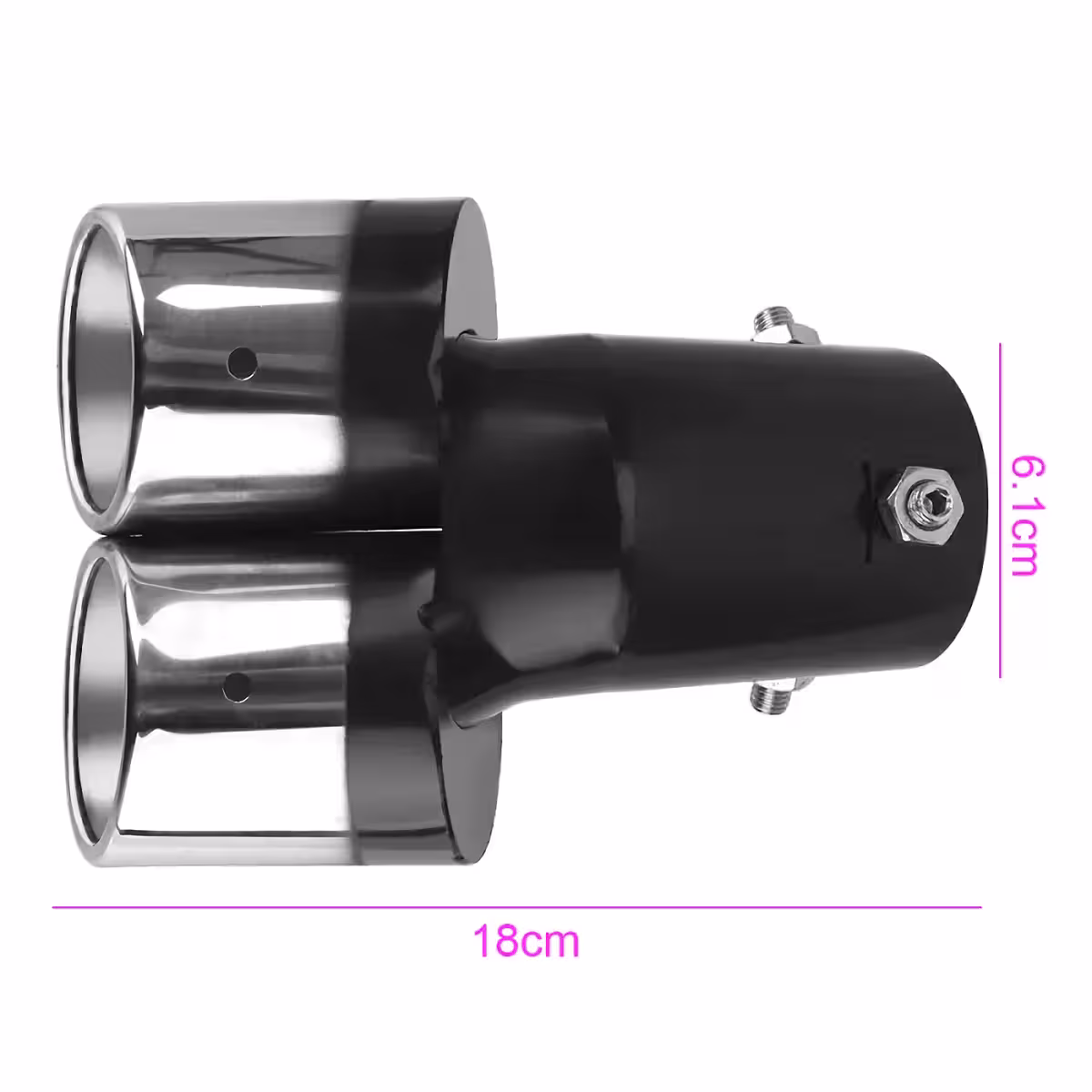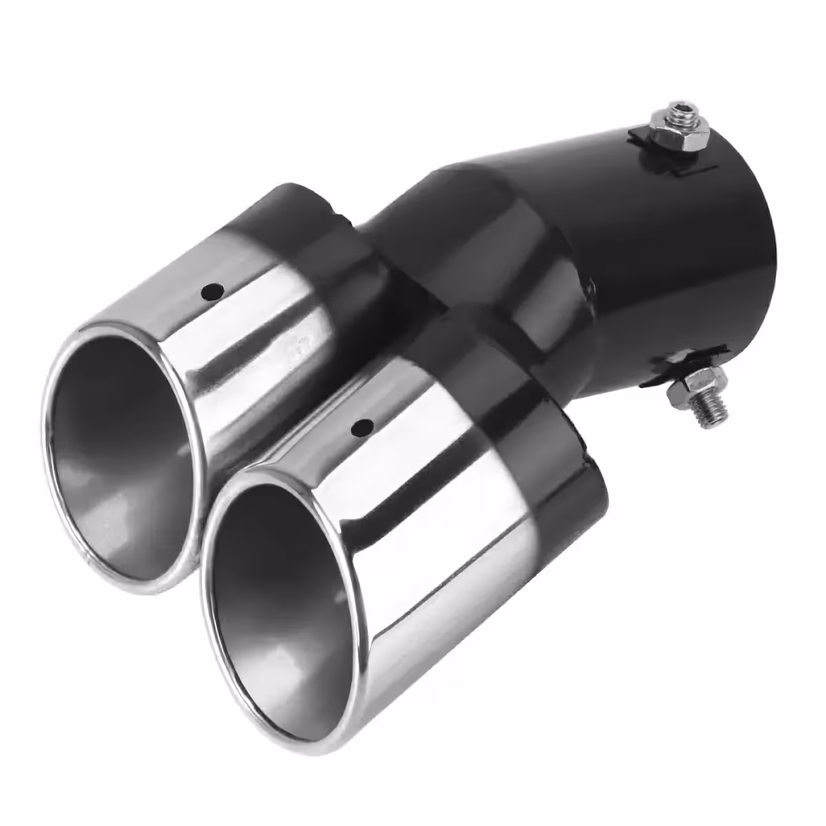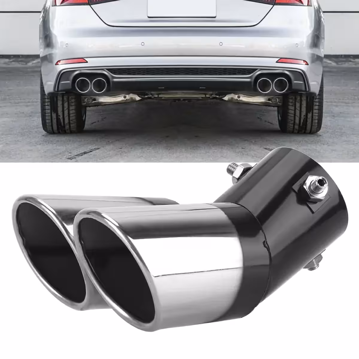 A dupla rozsdamentes kipufogóvég dísz egy stílusos és megkülönböztető elem járműved számára.