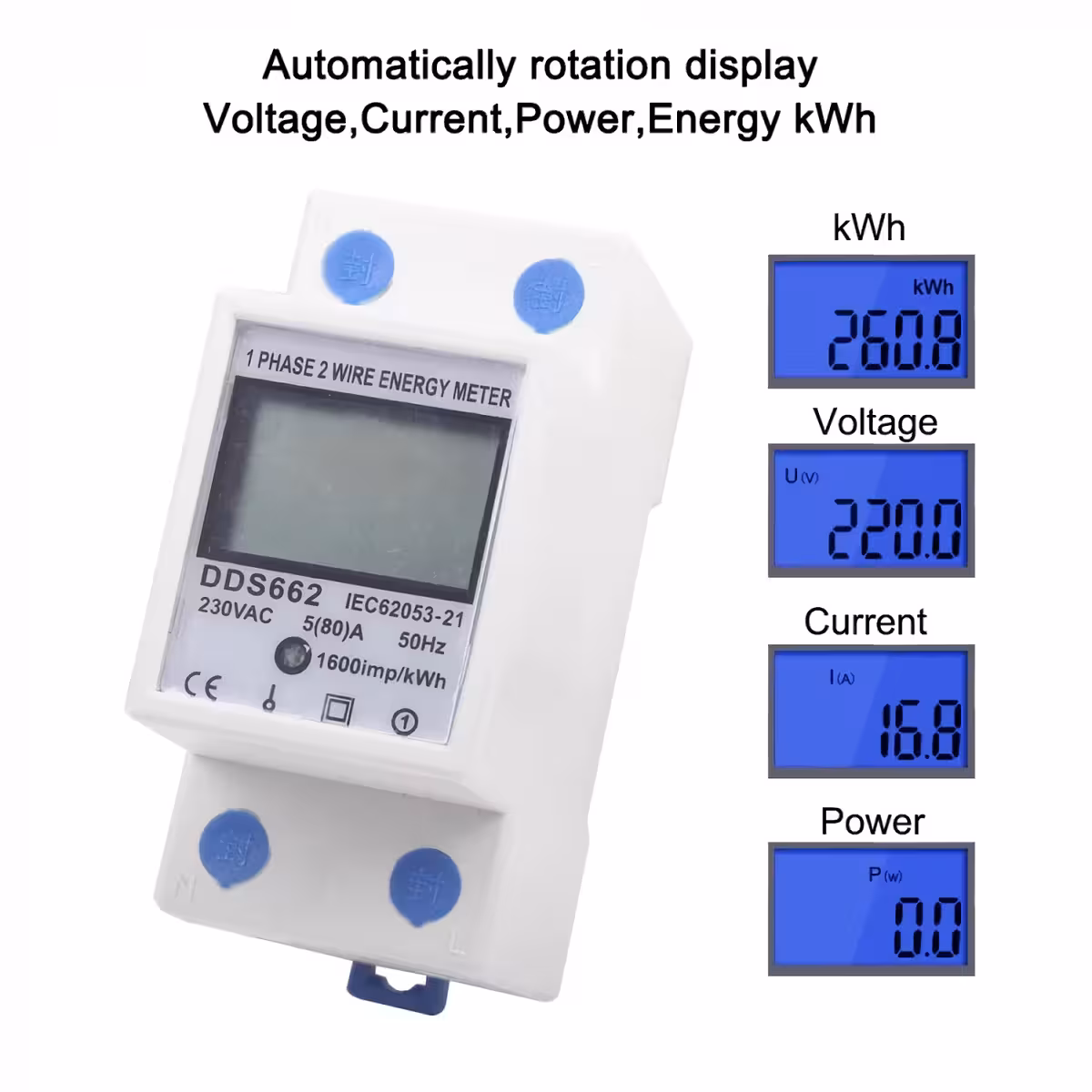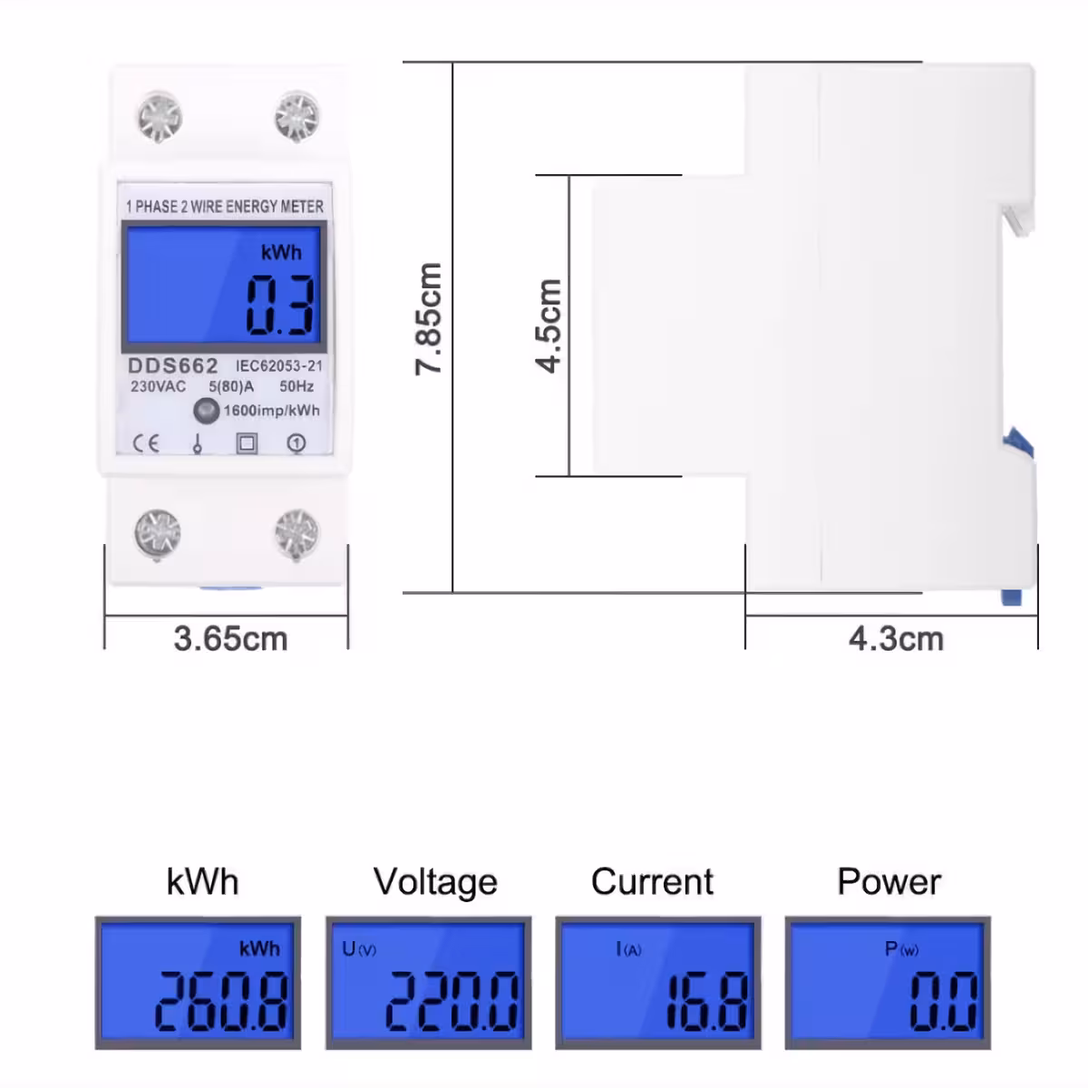 Csúcstechnológiás egyszakaszos villanyóra, 35 mm-es DIN sínre szerelhető, LCD digitális kijelzővel, amely pontosan és megbízhatóan méri az elektromos energiafogyasztást (kWh). Ideális lakossági vagy ipari használatra, a fogyasztás, feszültség, áram és teljesítmény nyomon követésére.