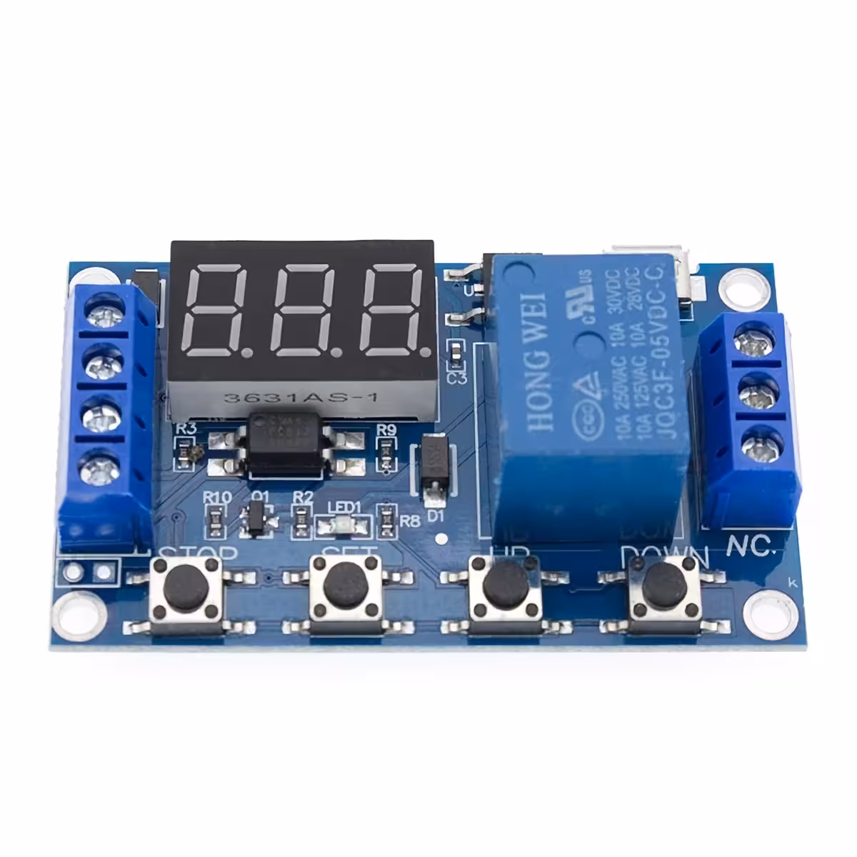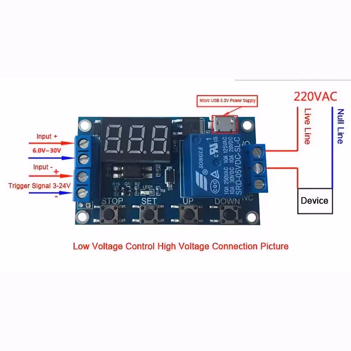 Időzített relé modul állítható idővel, kompatibilis 6–30V-tal (5V MicroUSB táplálás is lehetséges). Ideális ipari és DIY alkalmazásokhoz, ahol időzített relére, vezérlésre és állítható időre van szükség, digitális kijelzővel és interferenciabiztos kialakítással.