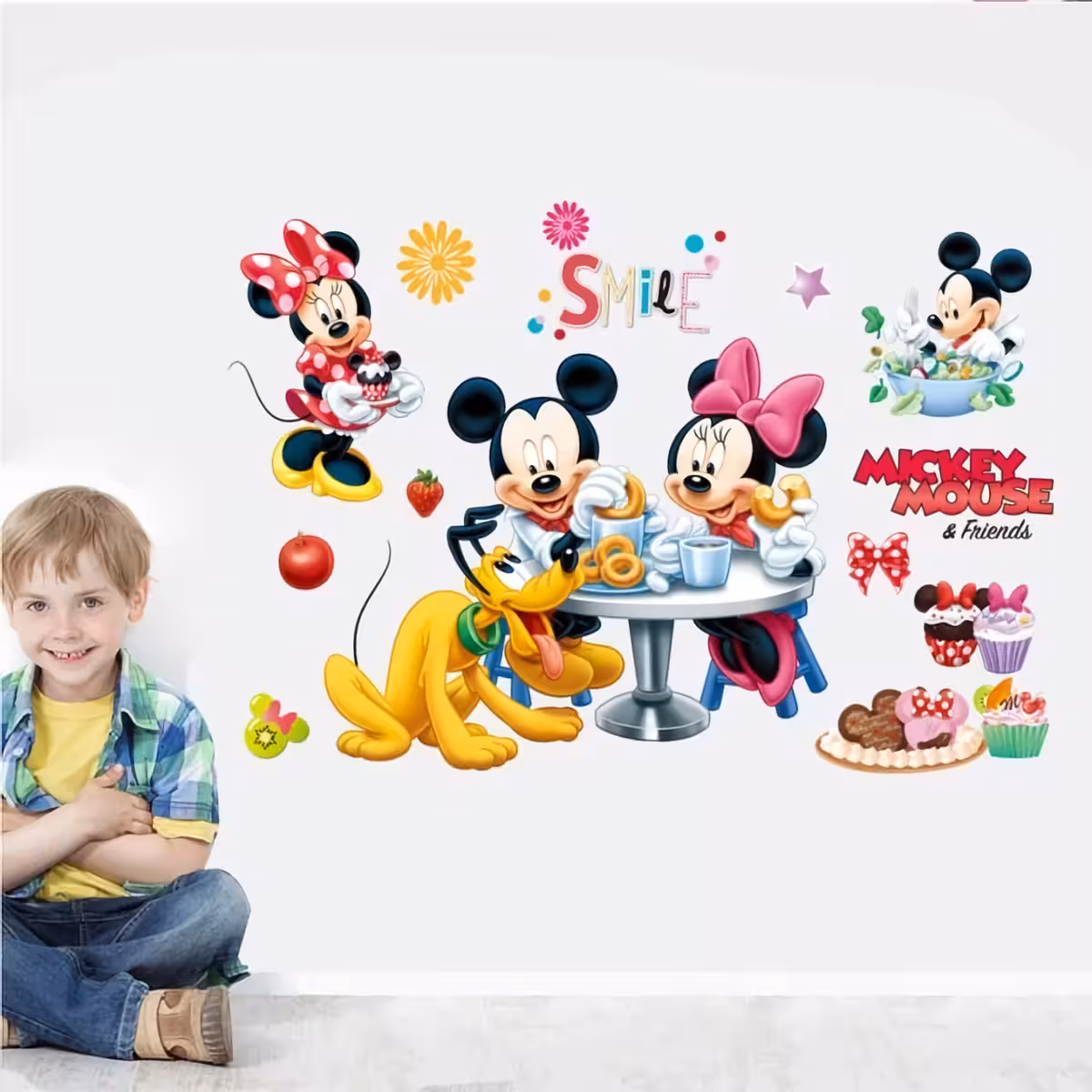 Öntapadós dekorációs matrica falra vagy bútorra, ideális gyerekszobákba, babaszobákba, óvodákba vagy játszóterekre. A kedvelt Mickey Mouse, Minnie Mouse és Pluto karakterekkel ez a színes szett vidám és kreatív hangulatot varázsol bármely térbe.
