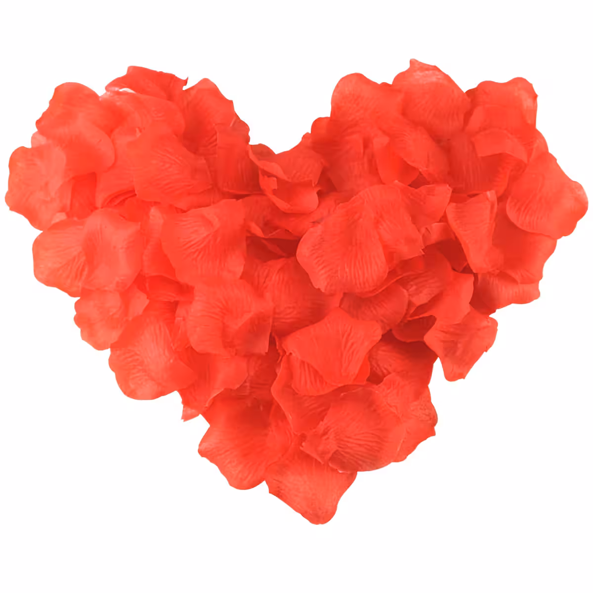 Mesterséges vörös rózsa szirmok, minőségi textilanyagból készítve, amelyek nem foltosodnak és nem tapadnak a dekorált felületekhez. Ezek a dekorációs szirmok bársonyos textúrával és intenzív vörös árnyalattal rendelkeznek, tökéletesek romantikus és elegáns hangulat megteremtéséhez.