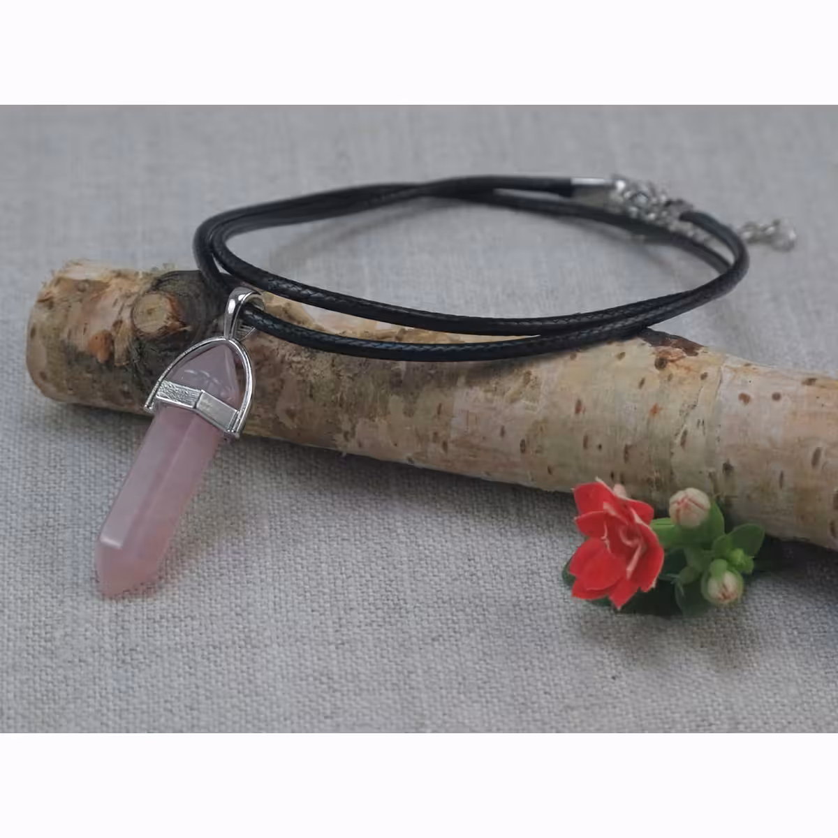 A csomag tartalma: rózsakvarc medál és bőrlánc, elegáns és tartós, karabineres záródással.