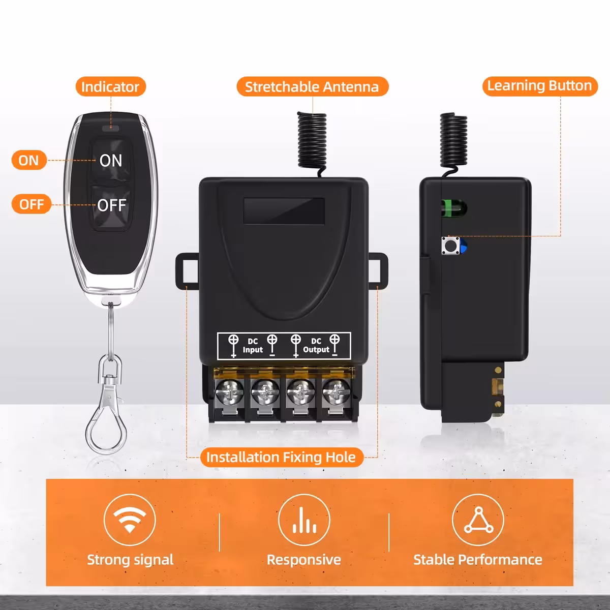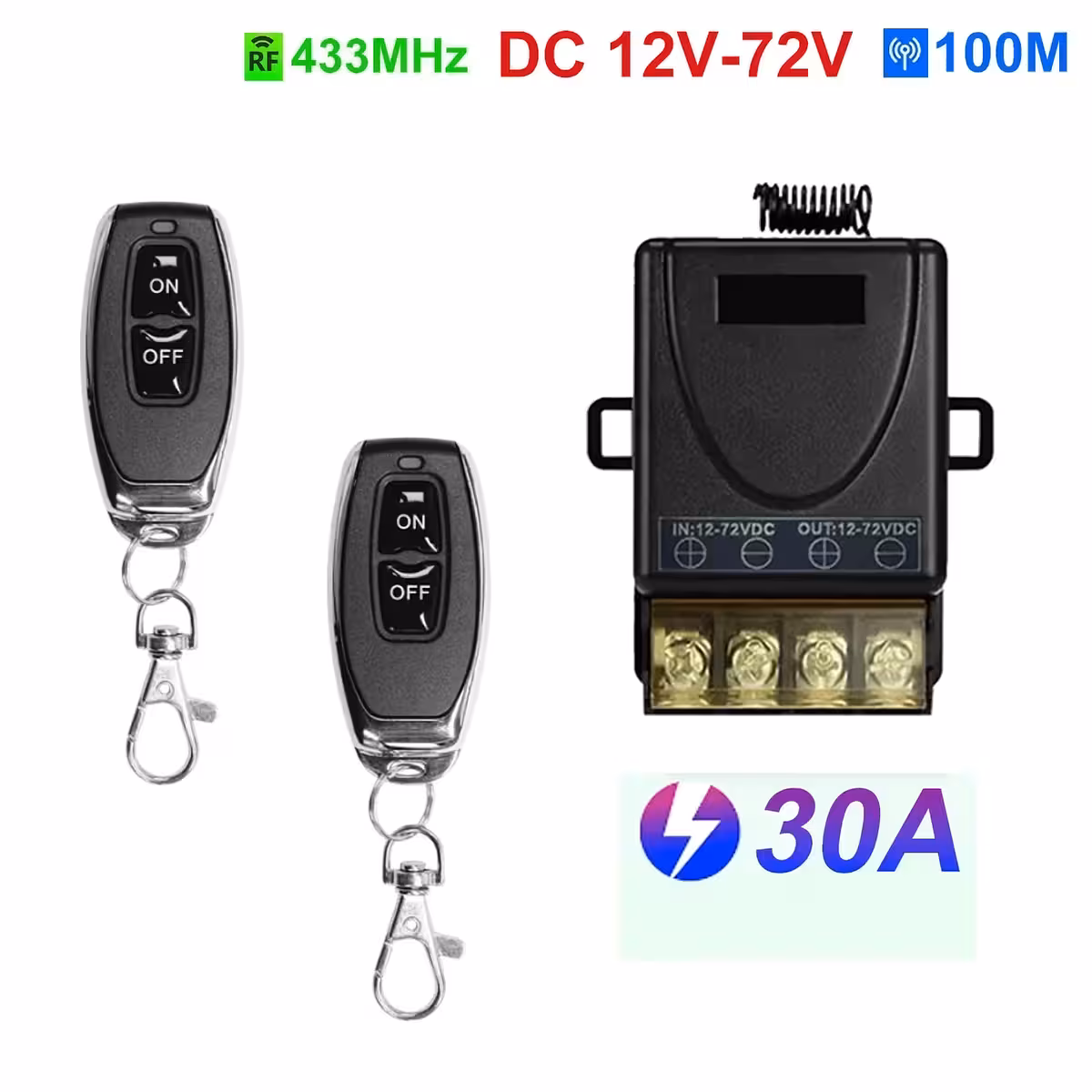 Ez a 12V–60V 30A távirányítós relé egy nagy teljesítményű kapcsoló, amely ideális szivattyúk, lámpák, gépek, aljzatok, autós vagy háztartási rendszerek, valamint okosotthon telepítések távoli vezérléséhez. 433,92 MHz RF frekvencián működik és 2 távirányítóval érkezik.