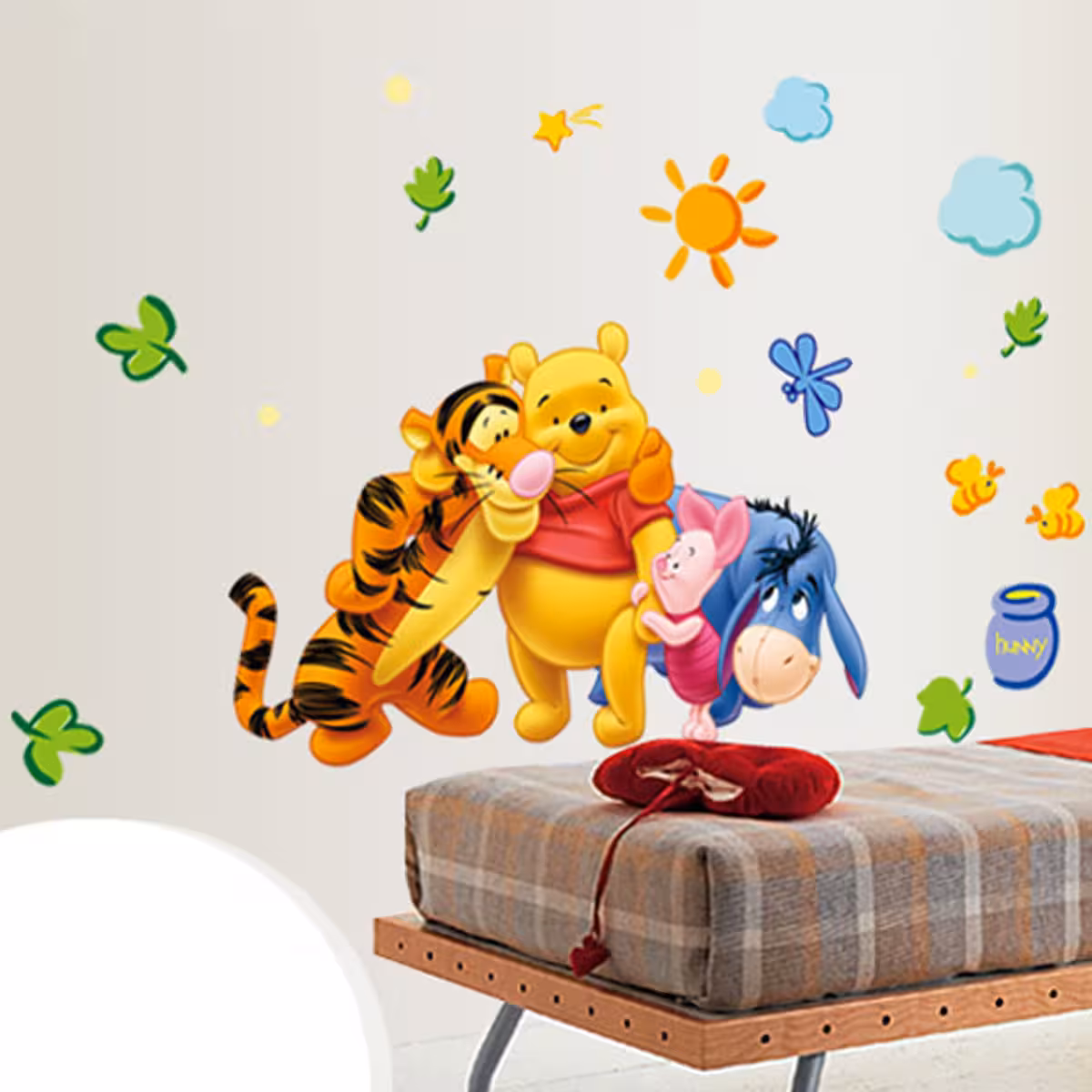 Winnie the Pooh egy aranyos, 25 cm magas mackó, ismert piros pólójáról és játékos személyiségéről. Ez a rajzfilm karakter öntapadós matrica örömet és színt visz bármely gyerekeknek szánt térbe.