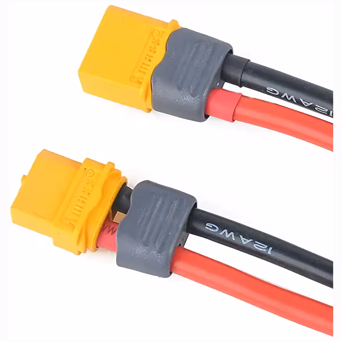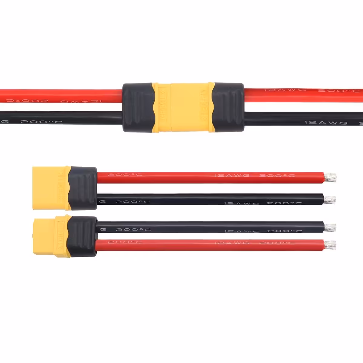Pár XT60H anya + apa vastag 12AWG szilikonkábellel, ideális Li-Ion, LiPo, LiFePO₄ akkumulátorokhoz és nagy áramú alkalmazásokhoz: elektromos rollerek, kerékpárok, power pack-ek, drónok, RC és hordozható UPS-ek.